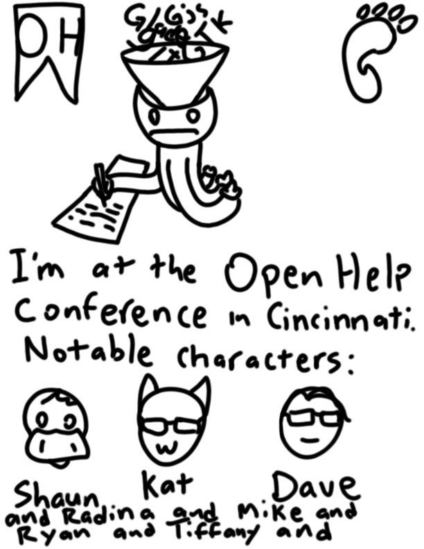 | Thanks to the Gnome Foundation, my dad and I were able to come to Cincinnati for Open Help 2013. I learned many things! I learned that I do not, in fact, have a grasp on JavaScript (nor did I know the proper capitalization), I learned a lot about Git, and I learned a lot about various Gnome technologies. We got a lot of documentation done. I can't give you a link yet to what I personally wrote, but you could probably install a distribution of Linux that runs a recent version of Gnome and keep checking the documentation. At that time you will be able to Get Started writing Gnome applications. This stuff is pretty cool. Also: <3 Yellowtoast. |